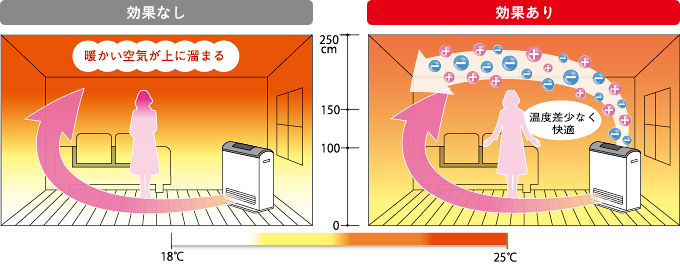 お部屋の天井付近に溜まった暖かい空気を循環させることで、足もとまで暖かさが広がります。室内の上下の温度差が小さくなり、室内を効率よく暖められるため、快適性に加えて省エネ性もアップします。