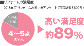 リフォーム完成後のお客さまアンケートでは、プラン提案から工事にいたるまで、一つひとつの工程においてのきめ細やかな対応に高い評価をいただき、約90%※2のお客さまから満足のお声をいただいています。