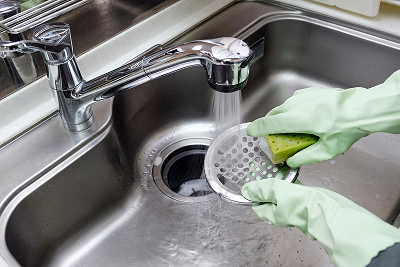 シンクの白い跡、排水口まわりのぬめり・においをまとめてクリーニング。天板や壁面は素材に合う洗剤で丁寧に仕上げます。
