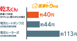 上記金額は燃料、原料費調整額を除く。原燃料費が高い場合は、原燃料費調整額により乾太くんの料金が電気式全自動洗濯乾燥機(ヒートポンプ式・ヒーター式)と比較して高くなることがあります。