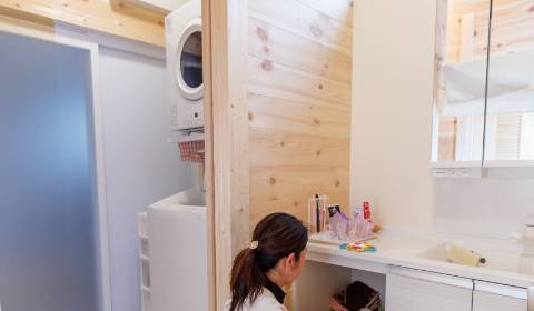 「乾太くん」は洗濯機の上に設置し、さらにその隣の脱衣室にタオルの収納スペースを設けたことで、洗濯→乾燥→収納がその場で完結する便利な動線になっています。また「乾太くん」はエココースや厚物コースなど機能も充実していて、洗濯物の状況に合わせて使えるので、とても満足しています。
