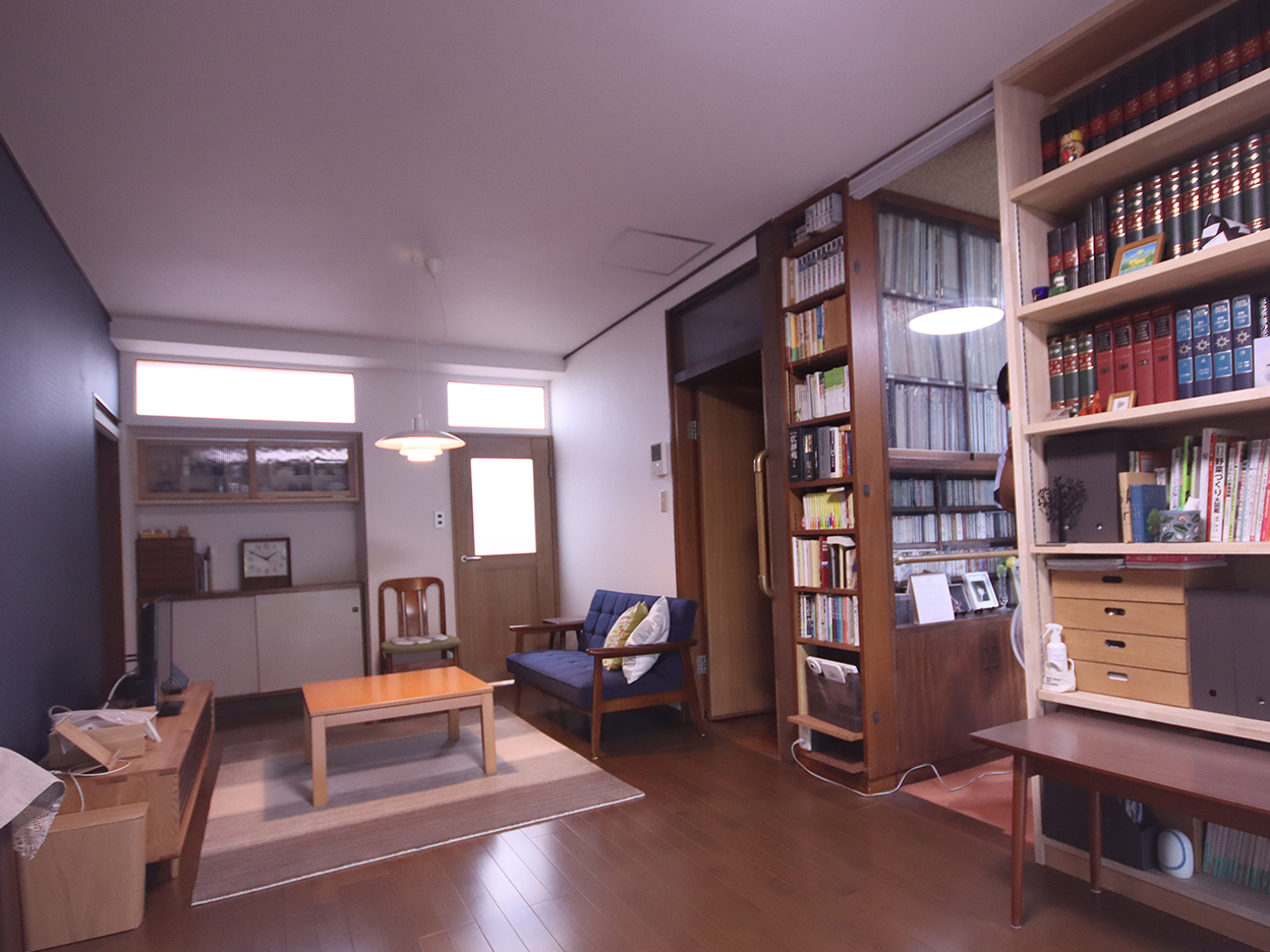 落ち着いた色調の北欧風のリビングになりました。お父さまが使っておられた戸棚のガラスをリユースした造作棚を取り付けました。床暖房を設置し、冬も居心地よくなりました。