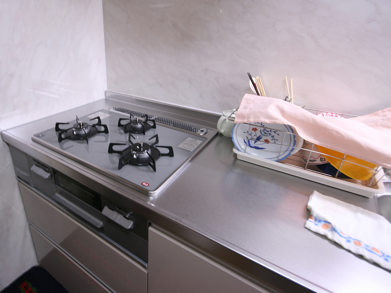 収納は観音開きの扉から引出し式に変わり、上から見渡して調理道具をスムーズに出し入れできるようになりました。キッチンパネルや作業台、コンロも、お掃除もしやすくなり快適に。