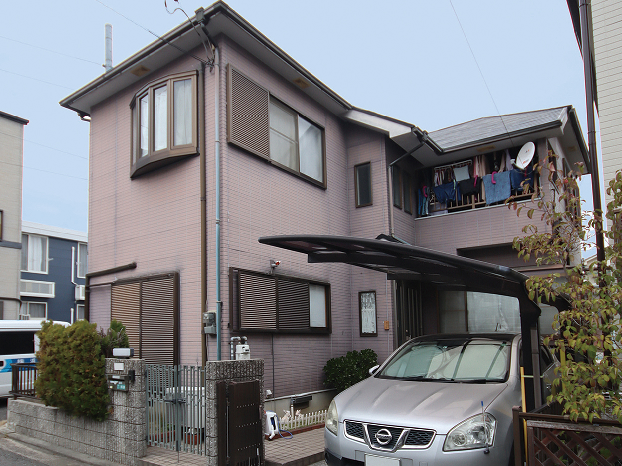 外壁をピンクグレーに塗装し、新築のような美しい外観に。2階南の窓を入替え、部屋全体が明るく風通しがよくなりました。屋根はカバーエ法で断熱性と遮音性、耐久性を高めました。