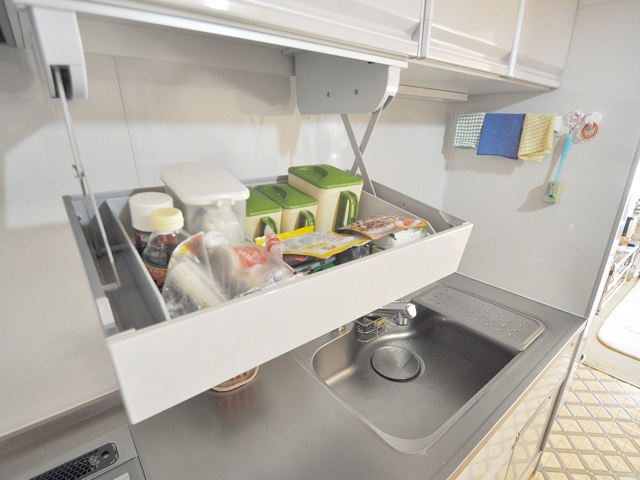 低くなった吊戸棚の下部には、システム昇降ラックを設置。収納した調味料などは調理しながら簡単に取り出せて、シンク前から動かずに作業が進められます。