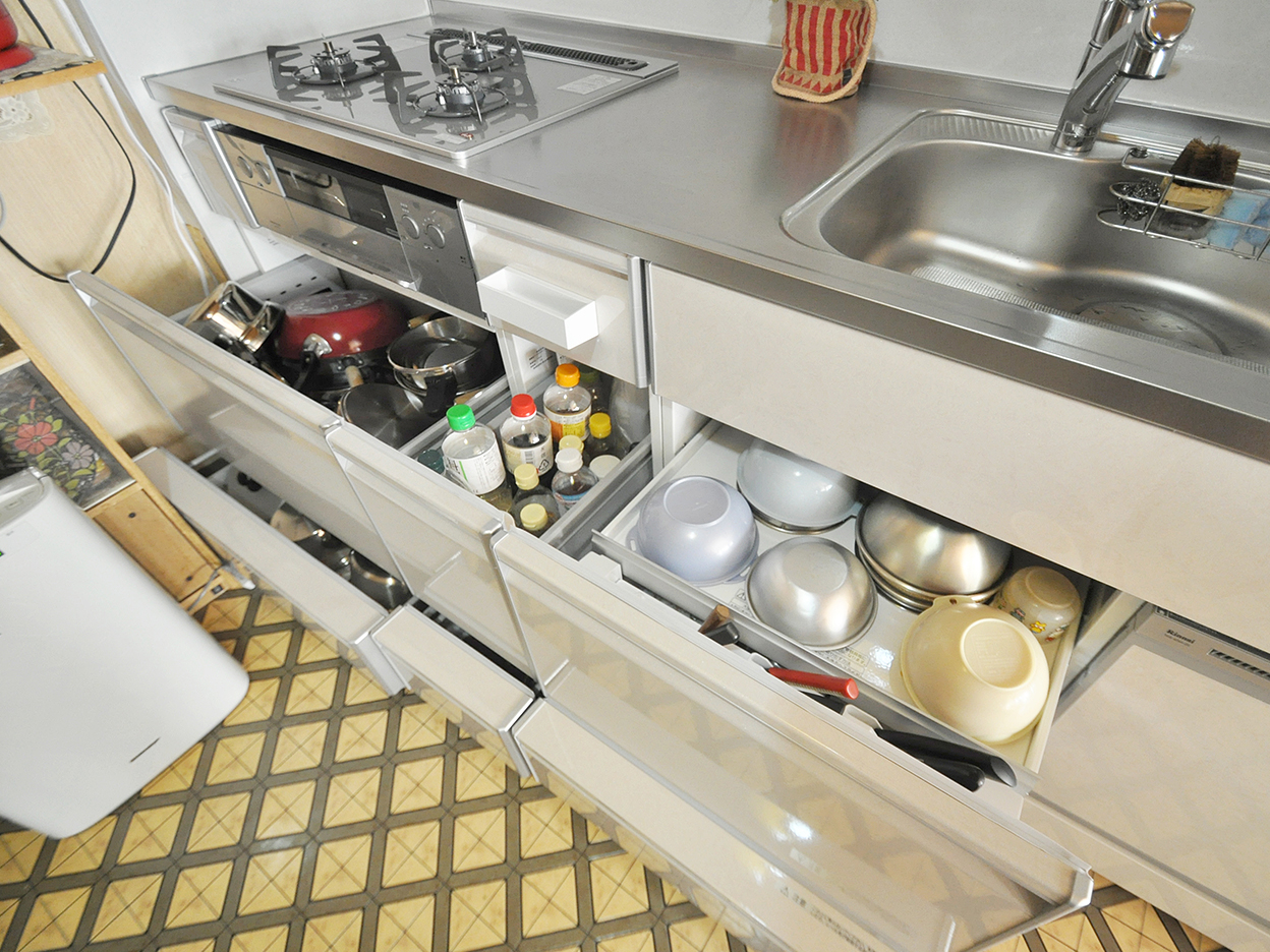 親族が集まるお盆や年末年始などにも大活躍する食器洗い乾燥機。シンク下に設置することで、床に水をたらすこともありません。プランニング時には、お客さまの使い勝手を考えてアドバイスをいたします。