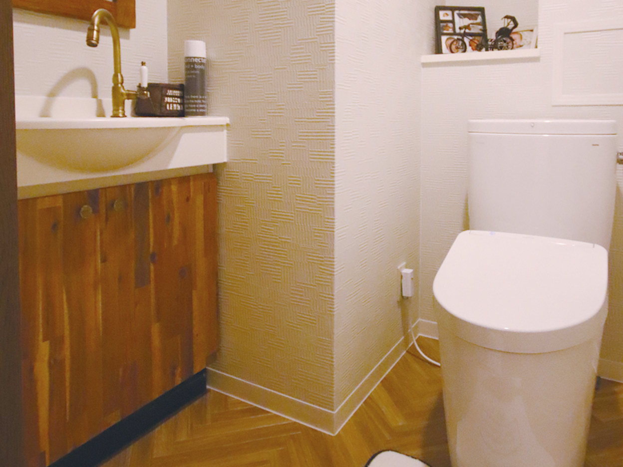 超節水トイレと手洗い用の水栓も取り替え。鏡の枠と収納の扉は、ラッピング加工をしました。