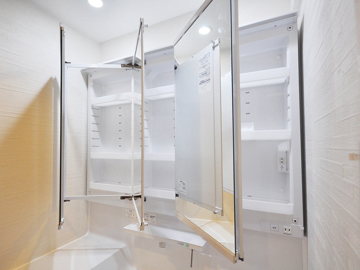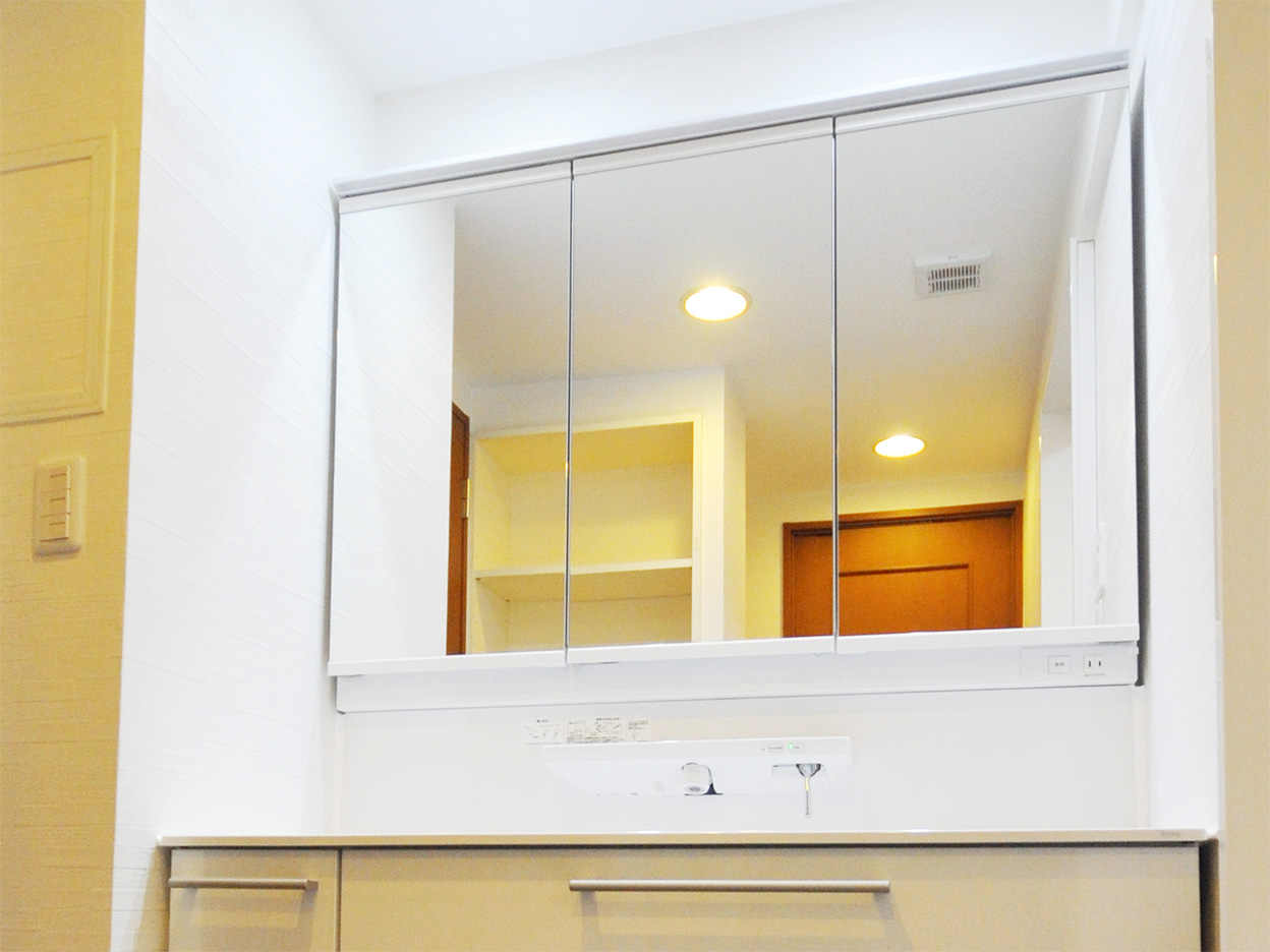 洗面化粧台は鏡の裏に広い収納があり、さまざまな洗面用品を収納可能です。