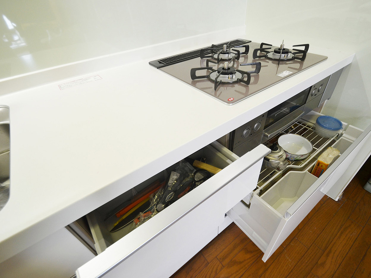 システムキッチンは清潔感のあるホワイトに。収納力のある引き出し式の収納で、カウンター周辺に物があふれることもなく、スッキリ明るいキッチンになりました。
