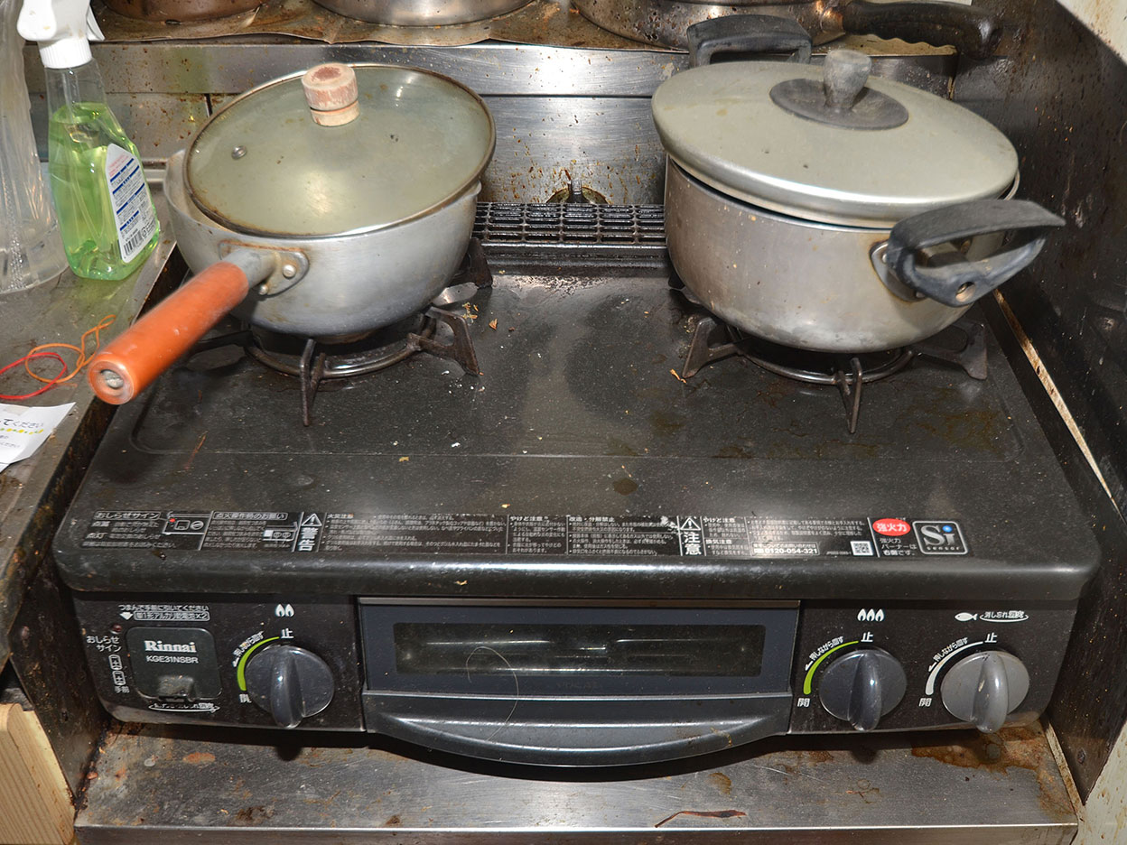 傷みが目立つコンロまわり