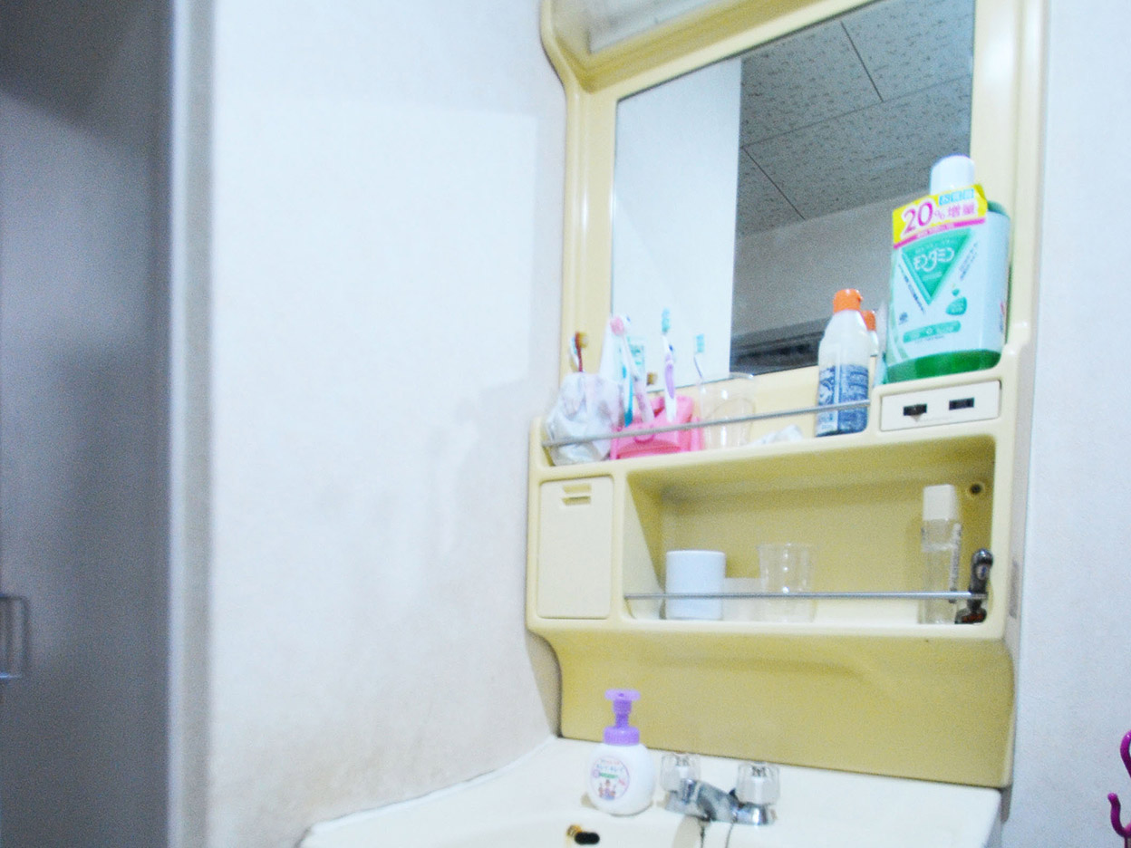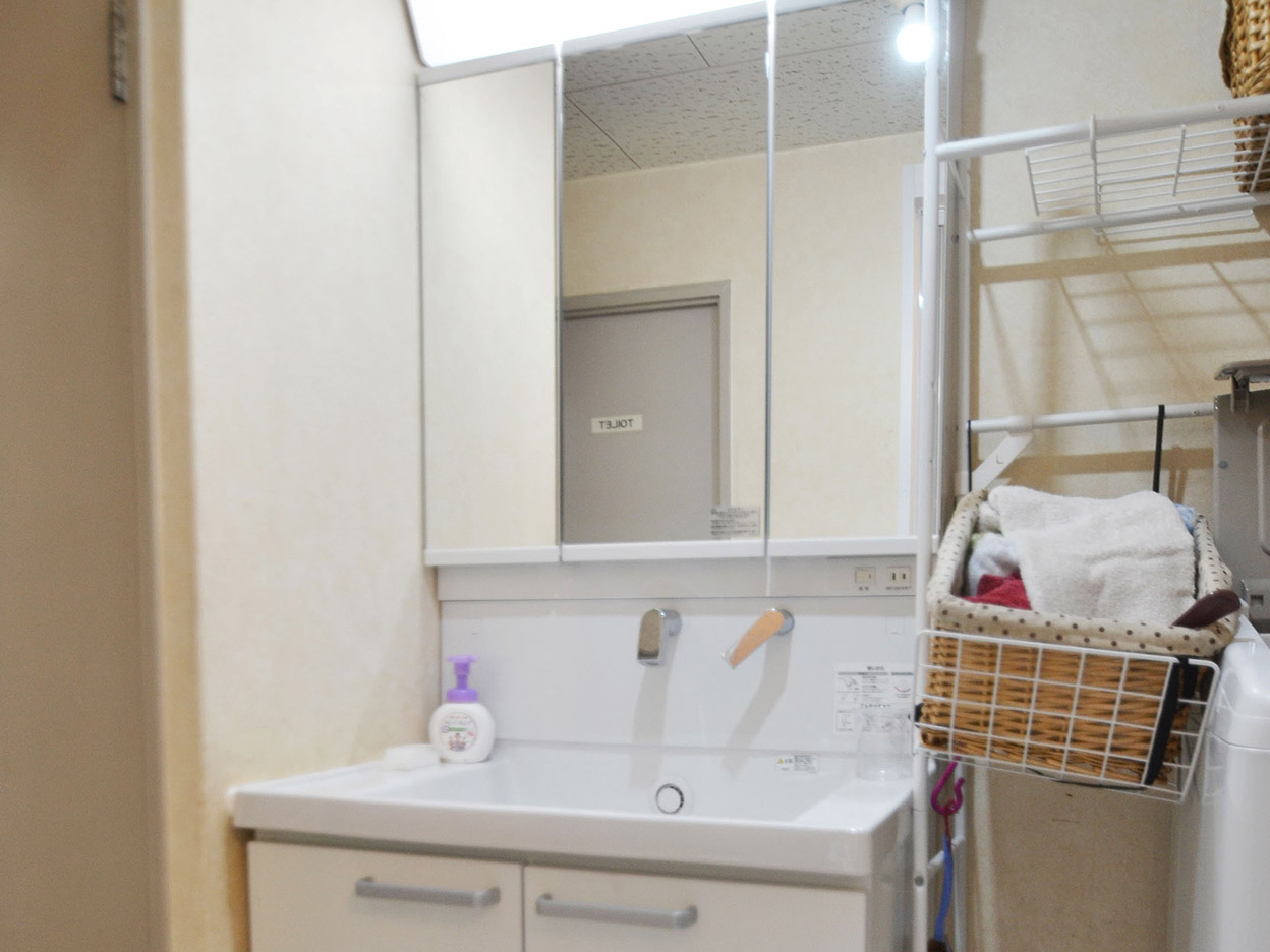 三面鏡タイプの洗面化粧台には、小物がスッキリ収納可能。鏡の高さもちょうどよくなったことで、手もともよく見えるようになりました。