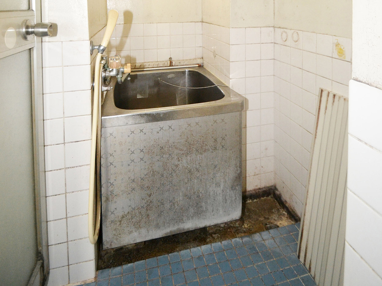 ステンレスの浴槽とタイルばりの床