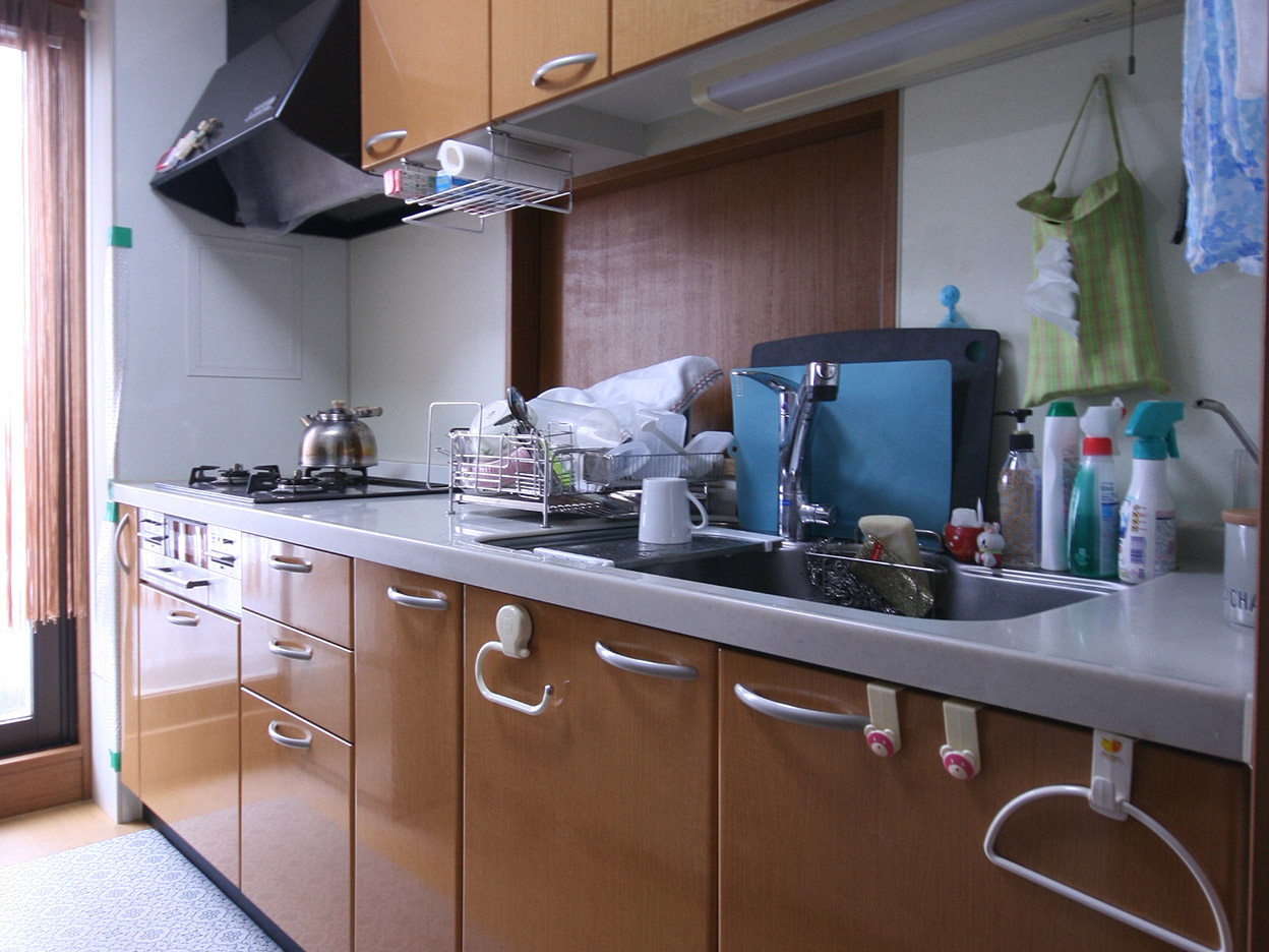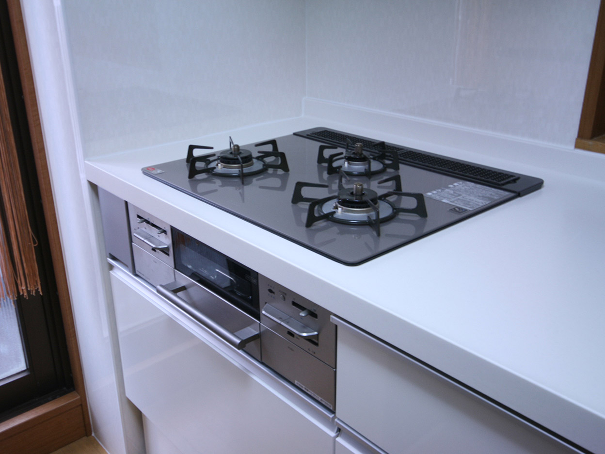 以前と同じ大きさのキッチンですが、引き出し式の収納なので調理道具が出し入れしやすく、収納量もアップ。今までワークトップに置いていた物も収納できます。