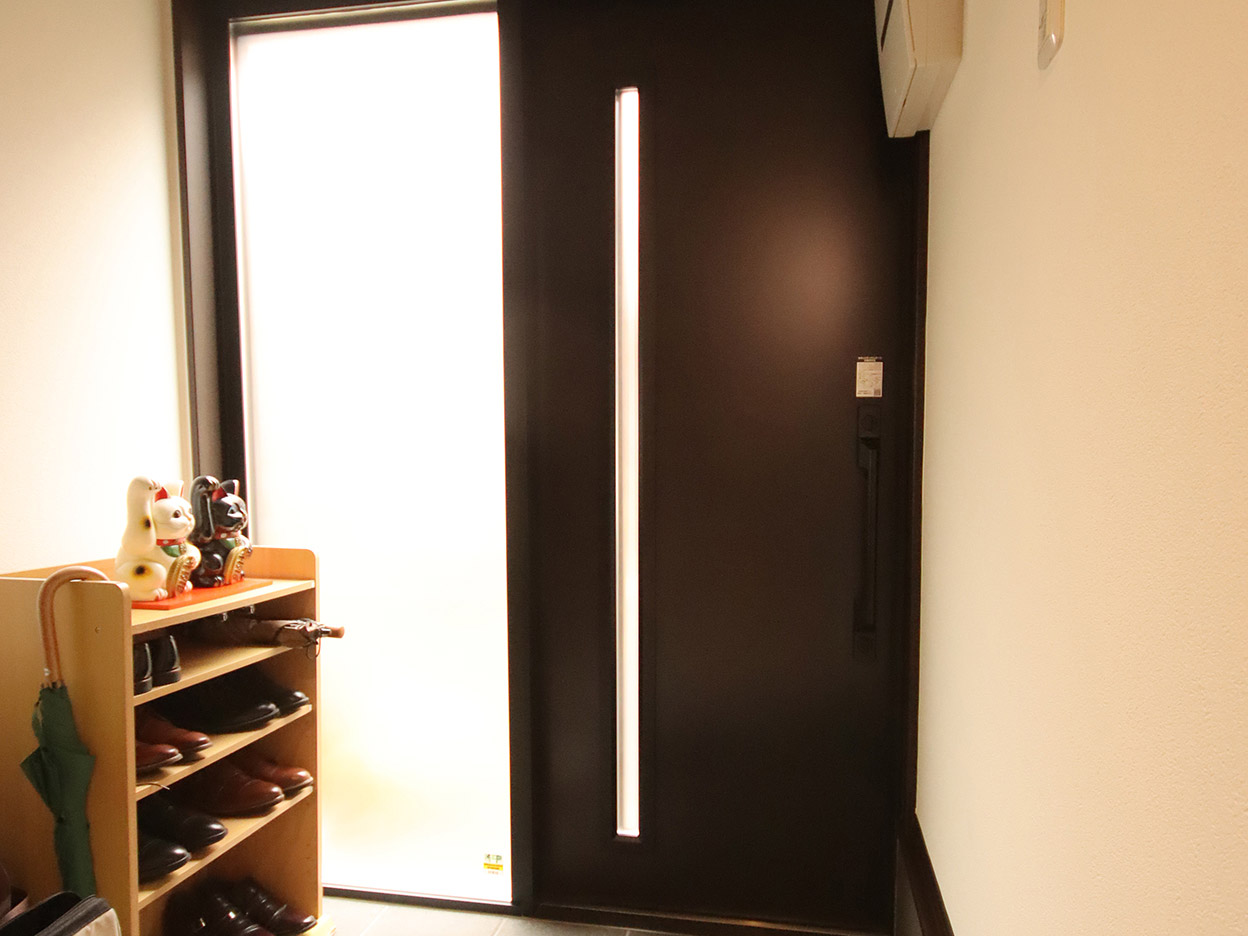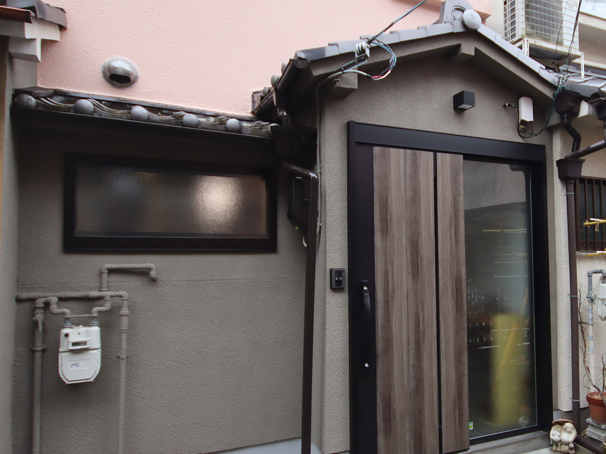 玄関の引き戸を入れ替えて壁もぬり替えたことで、外観は京町屋風の落ち着いた佇まいに。引き戸の袖ガラスで採光ができるので、お客さまを気持ちよく迎えられるようになりました。
