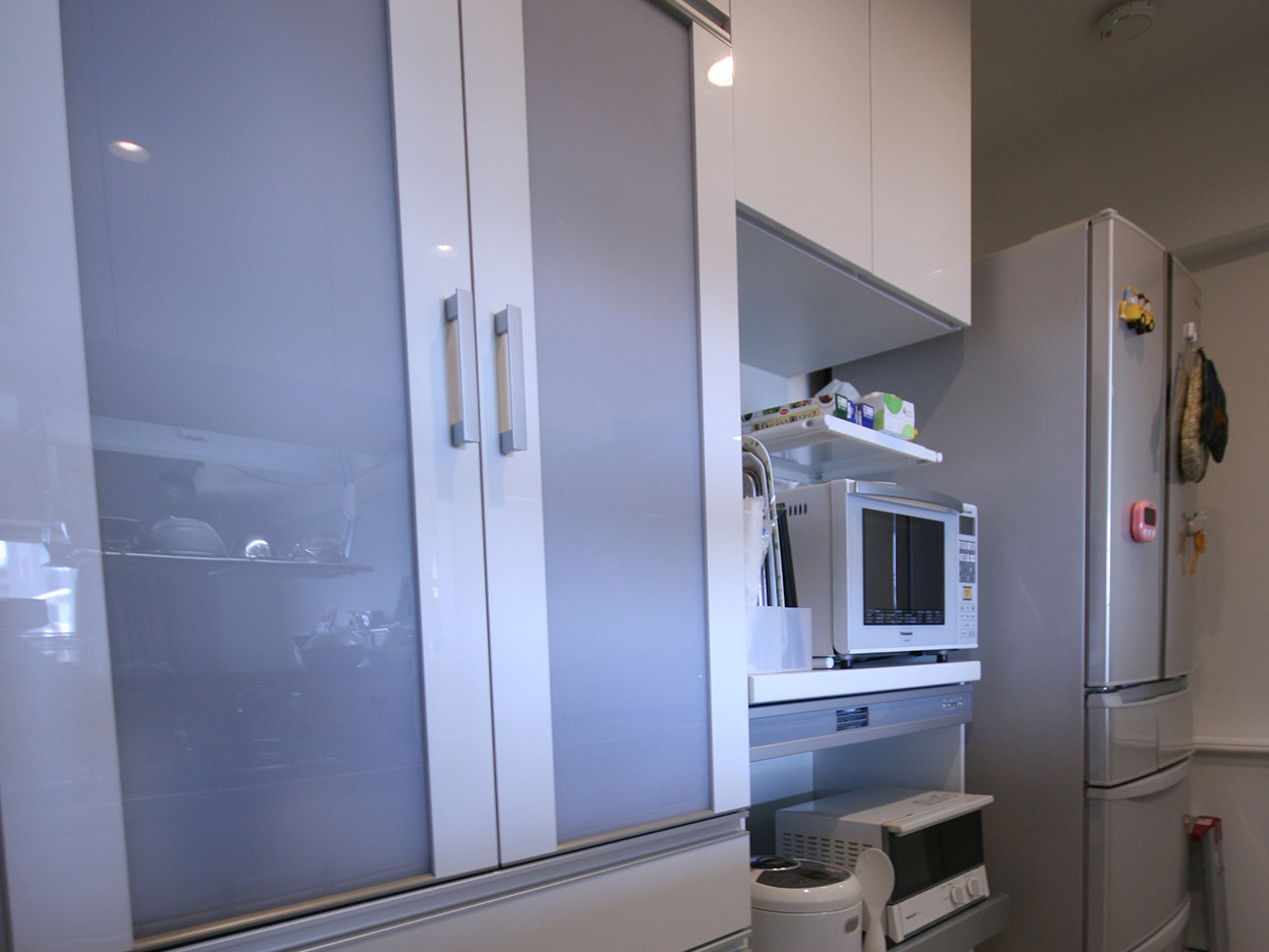 システムキッチンはシンクがコンパクトなものを採用。作業スペースが広がり、お料理や後片づけがしやすくなりました。また、設置した耐震ロック付きのカップボードやキャビネットの一番下の収納庫には、たくさんの食器類が収納できるように。
