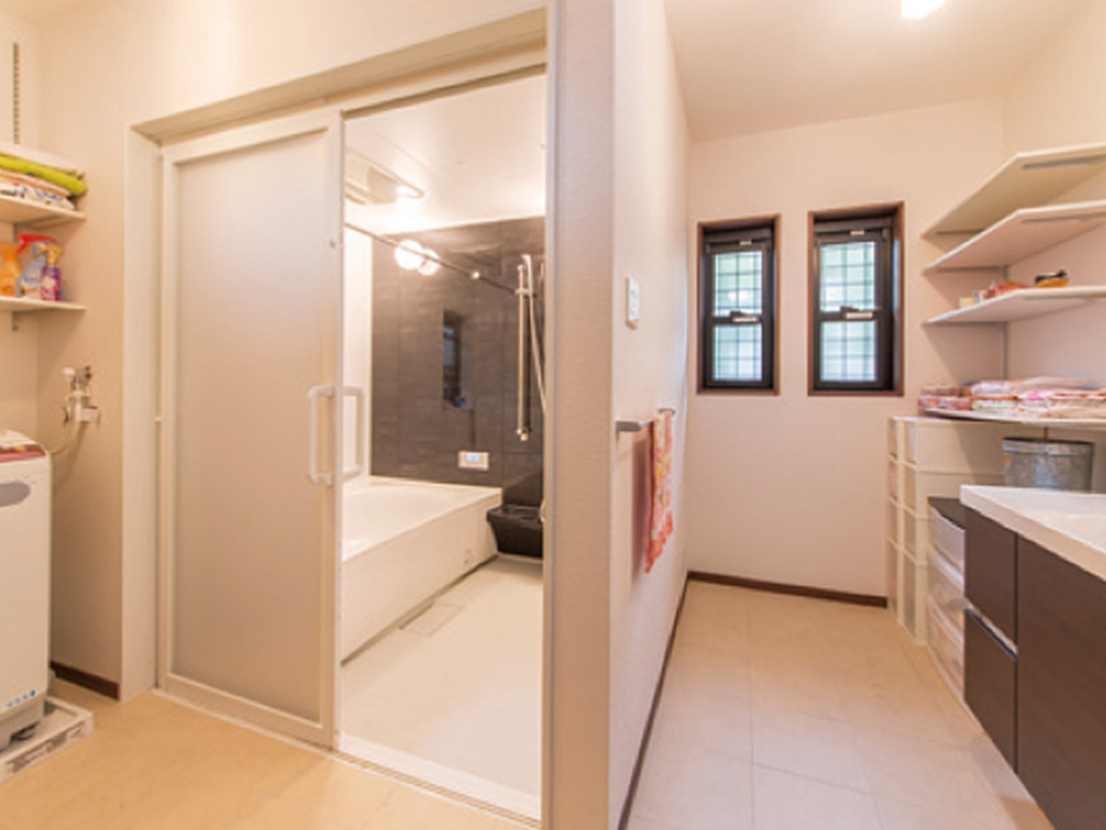 浴室と洗面、洗濯機置場が離れていたため、使い勝手と家事動線を考え間取り変更。2人が並んで洗顔ができる大きな洗面化粧台も設置しました。