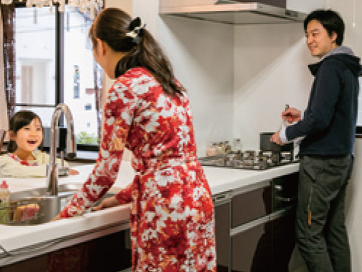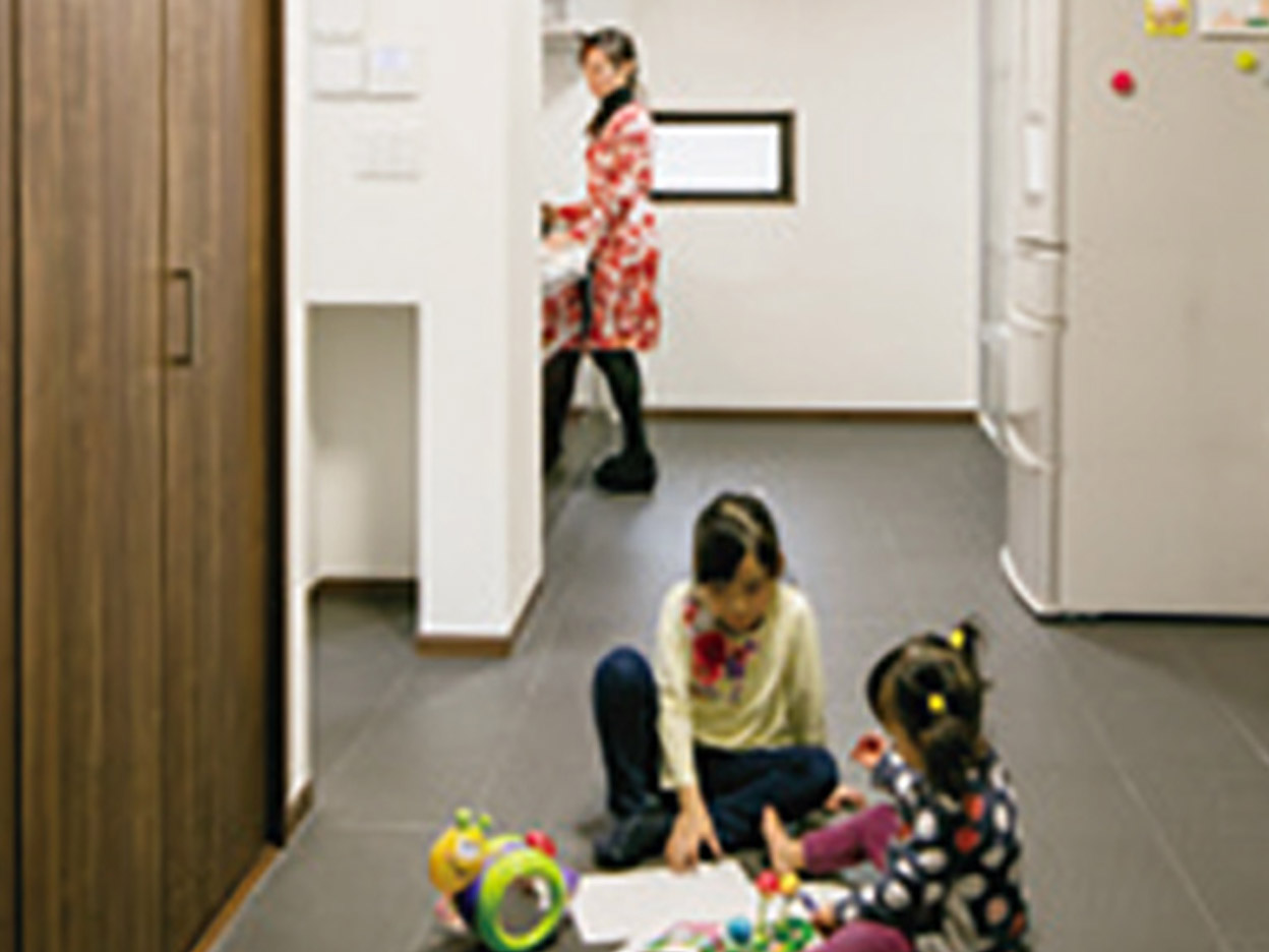 キッチンに立つ奥さまから、リビング、ダイニングで遊ぶお子さまの様子を、いつでも確認することができます。