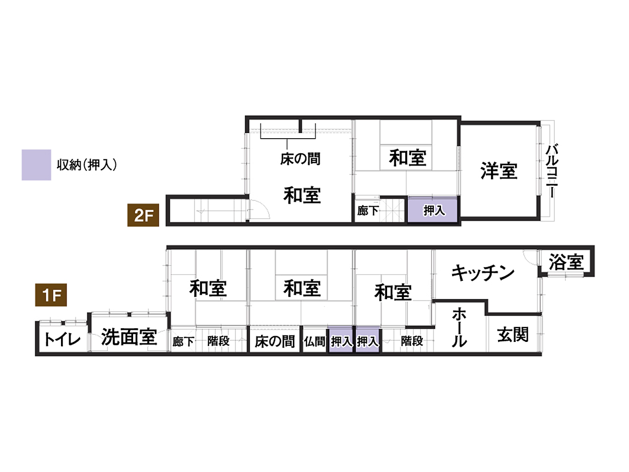 築50年以上で水まわりを中心に老朽化が進んでいたため、耐震補強を実施し、柱部分を残して全面リフォーム。1階は減築し、広々としたLDKのワンフロアの空間に。2階は2間の洋室にし、それぞれの壁面一面に収納スペースを設置。また、大きなバルコニーを増設し、開放的な空間になりました。