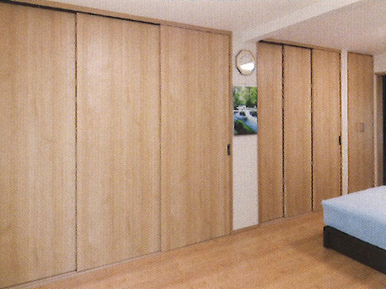 3間つづきだった2階は、トイレのある廊下をはさんで2間の洋室に。それぞれの壁面一面を大容量の収納スペースにしたので、スッキリとした広々空間になりました。