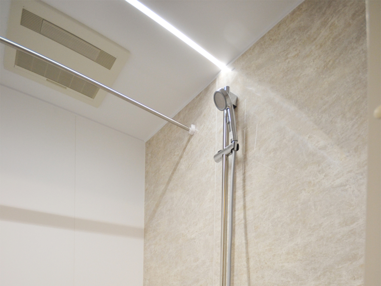天井がフラットになる線状の照明が浴室全体を照らします。