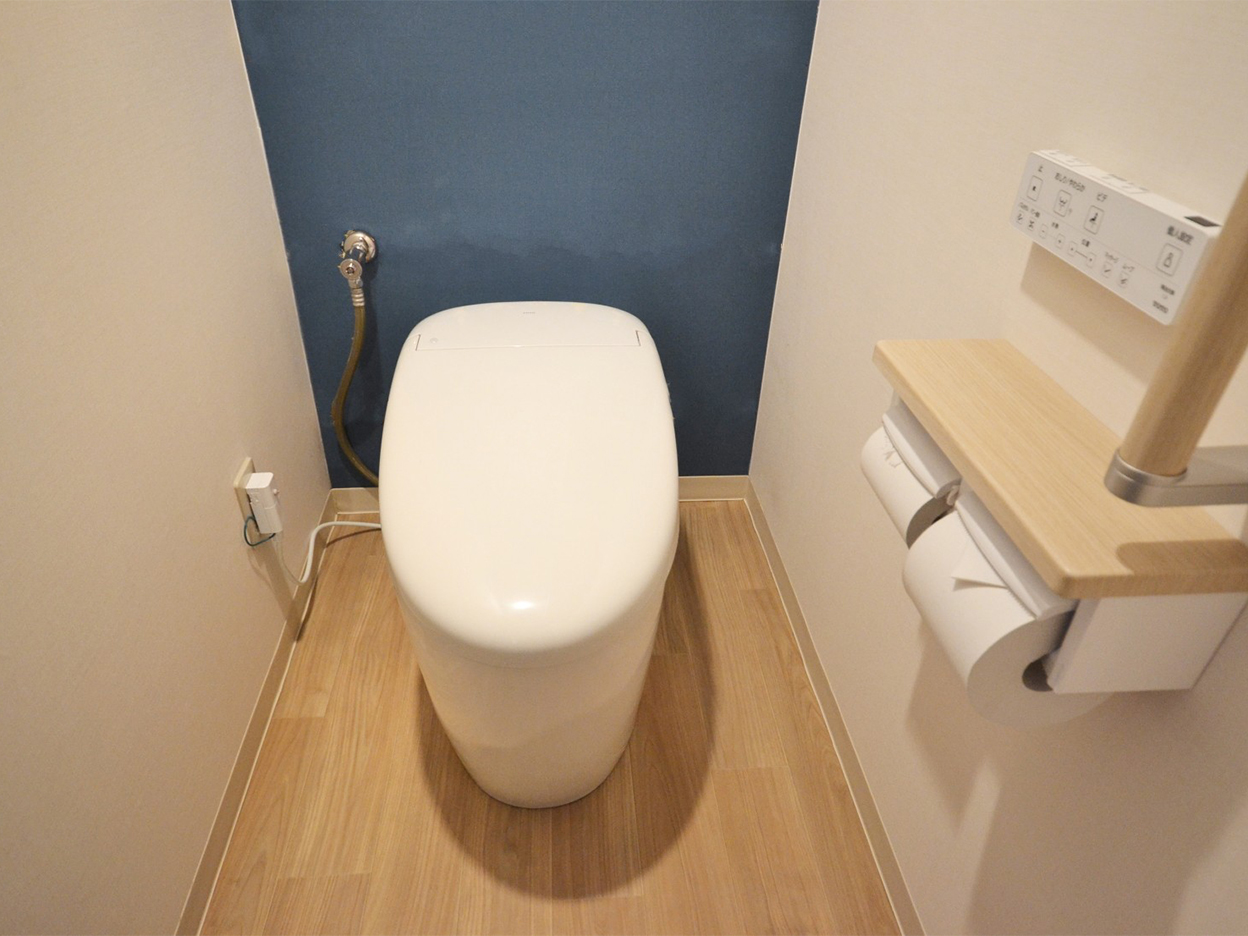 タンクレス仕様で空間が広く、掃除がしやすくなりました。壁紙、床、機能など、お客様へのおもてなしを考えたトイレ空間です。