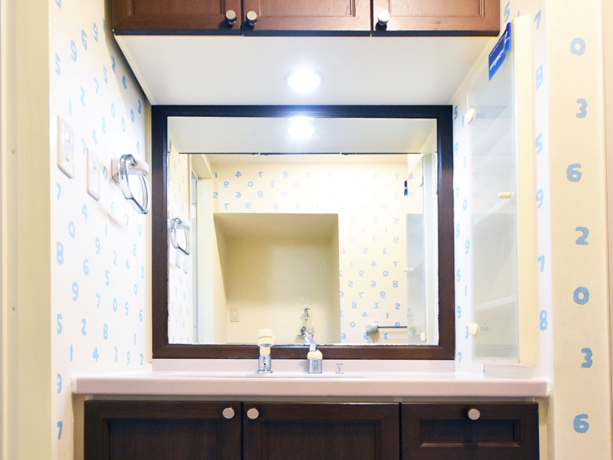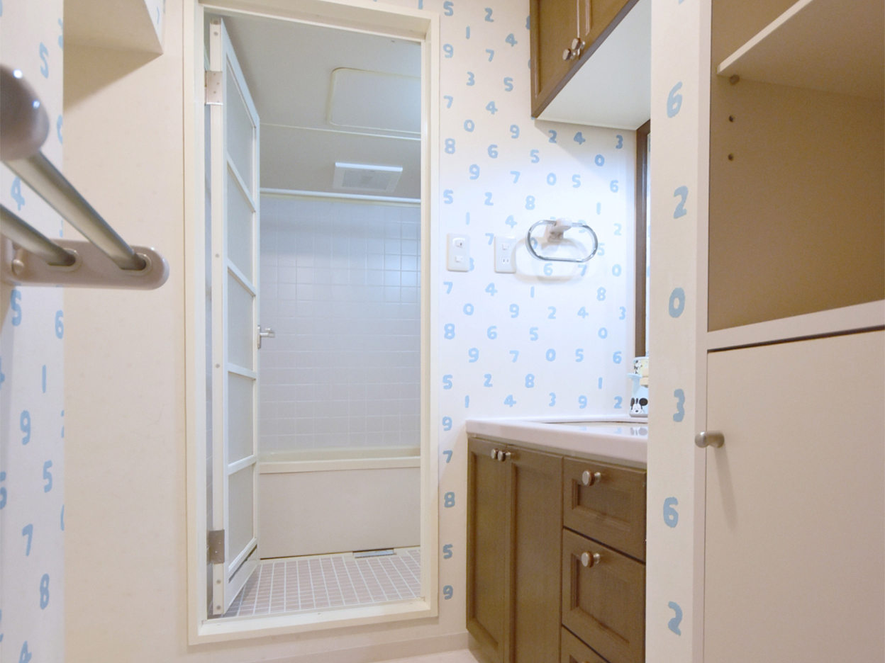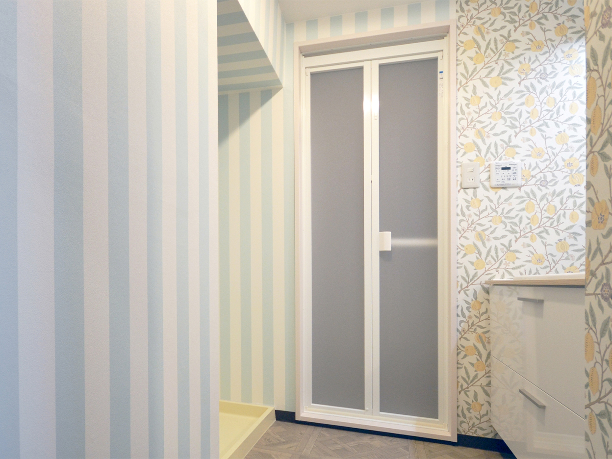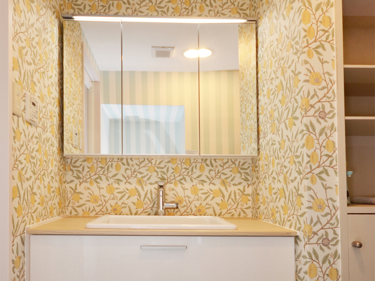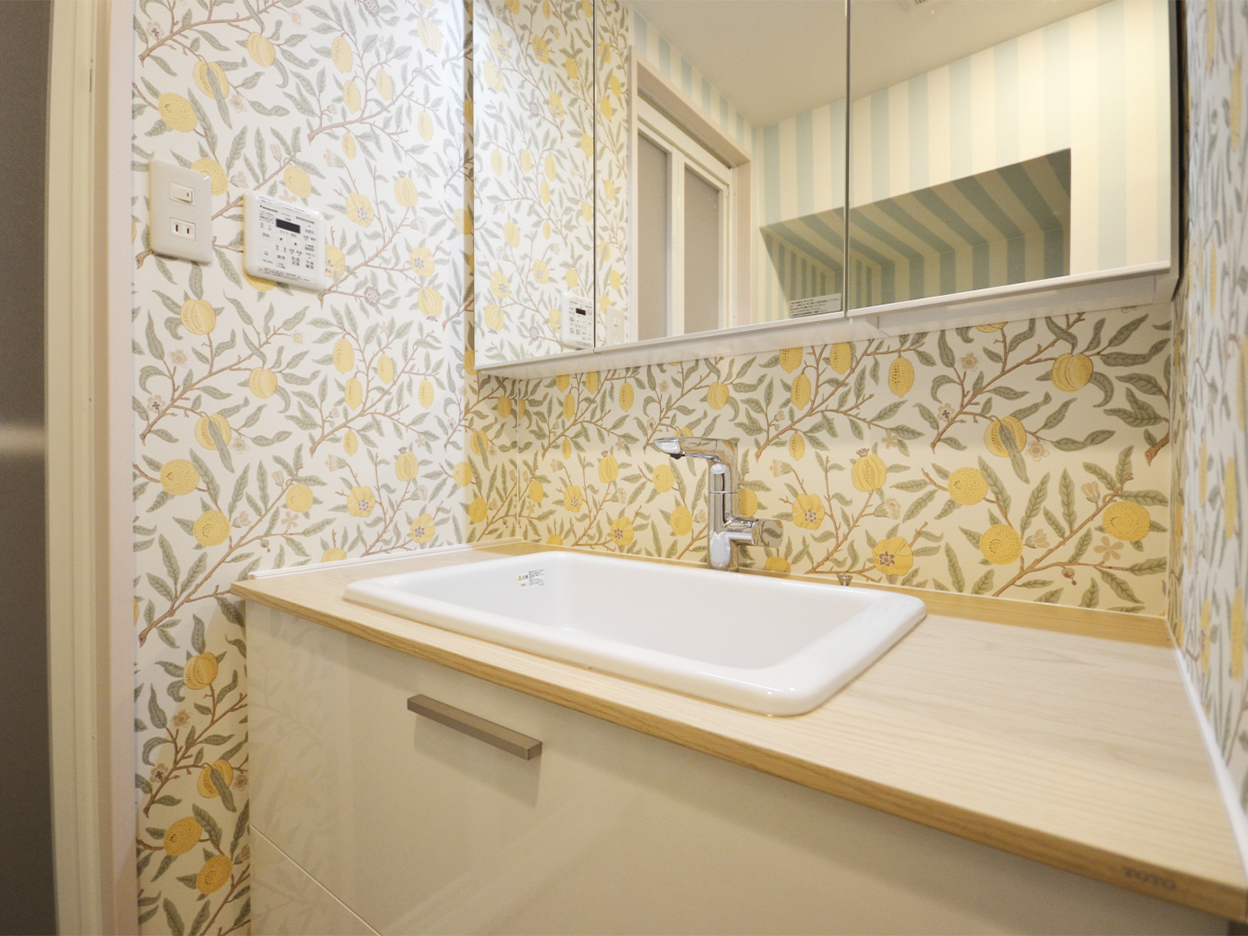 印象的な壁紙で明るく爽やかな印象に生まれ変わった洗面室。
