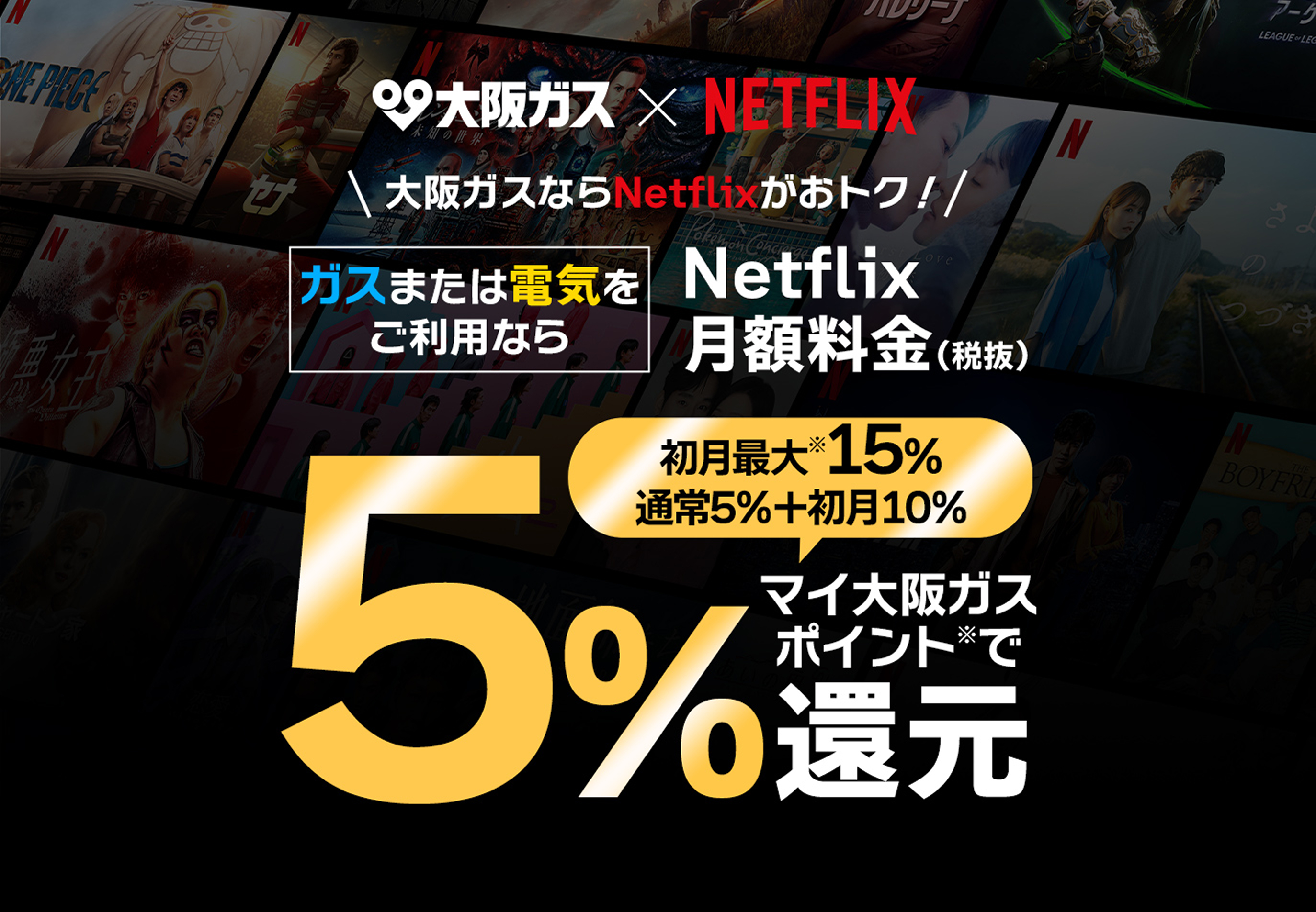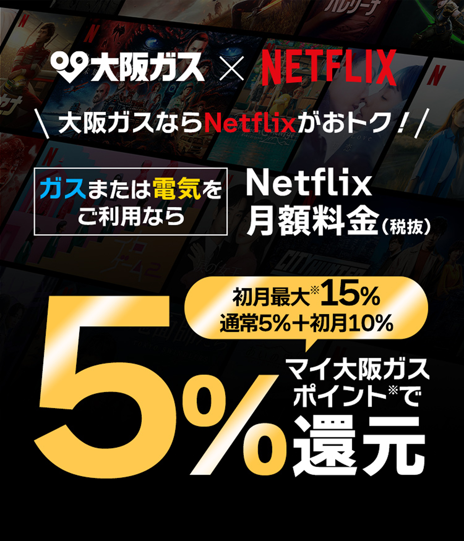 さらに、無料期間後も継続してご利用いただくと、1ヶ月目※2は最大15%、2ヶ月目以降は毎月5%のマイ大阪ガスポイントを還元※3!既にNetflixをご契約の方※4も対象!