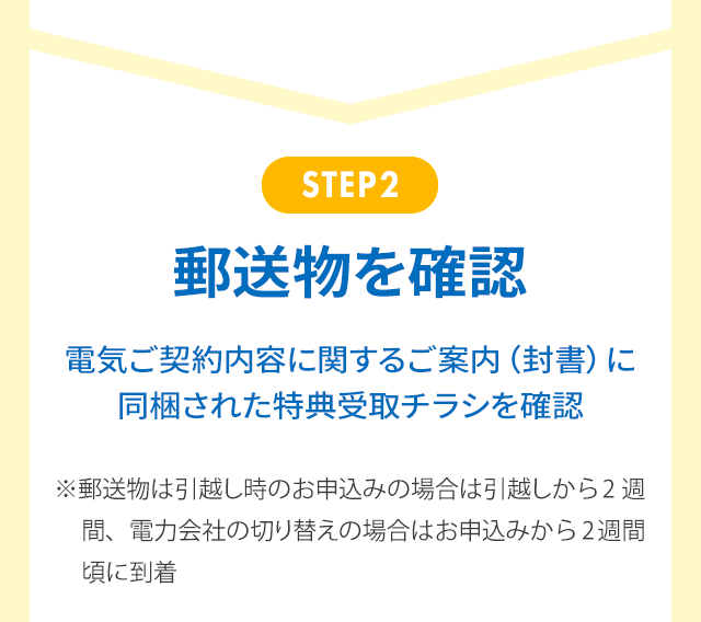 電気供給開始日から3ヶ月後の月末までに特典のお申込みが必要です。