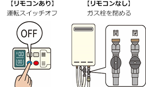 ガス給湯器のリモコンの運転スイッチをオフにしてください。リモコンがない場合は、ガス給湯器のガス栓をしっかりと閉めてください(次の
