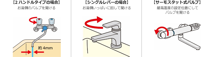 - 台所などの本来お湯の出る蛇口を少し開けてください。